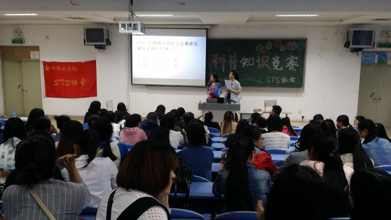 扬科技风帆,宣传科普知识,浓郁科技氛围。为了激发同学们对科学文化知识的浓厚兴趣,坚实科学文化基础知识,增加、开拓知识面。科学文化学月系列活动--STS协会科普知识竞赛在郑州师范学院西校区4阶2教室。各学院近200位同学参与其中,晚上大家齐聚4阶2教室。