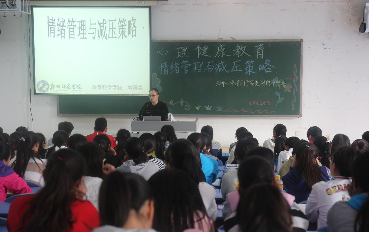2016年10月18日下午4时,化学化工学院在郑州师范学院西校区四阶二教室举办心理讲座。本次讲座由教育科学学院刘国清老师主讲,全体16级新生参加。