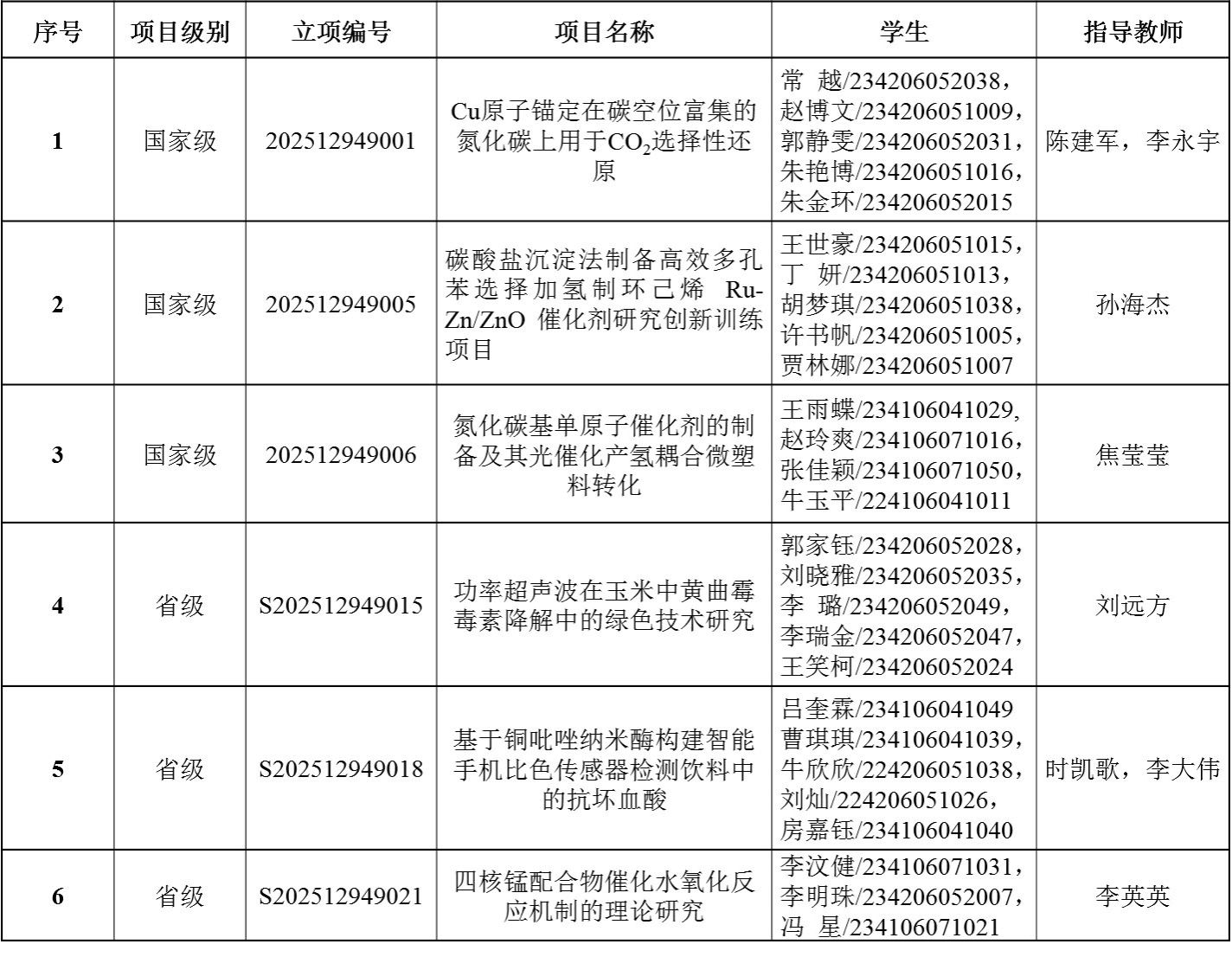 近日,河南省教育厅正式公布了2025年河南省大学生创新创业训练计划项目立项名单。化学化工学院表现突出,共有6个项目成功获批,其中包括国家级项目3项、省级项目3项。获批项目聚焦二氧化碳捕集、微塑料降解、清洁能源转化、食品安全检测与计算模拟等前沿热点领域,充分彰显了学院在推动创新创业教育改革和提升人才培养质量方面取得的扎实成效。