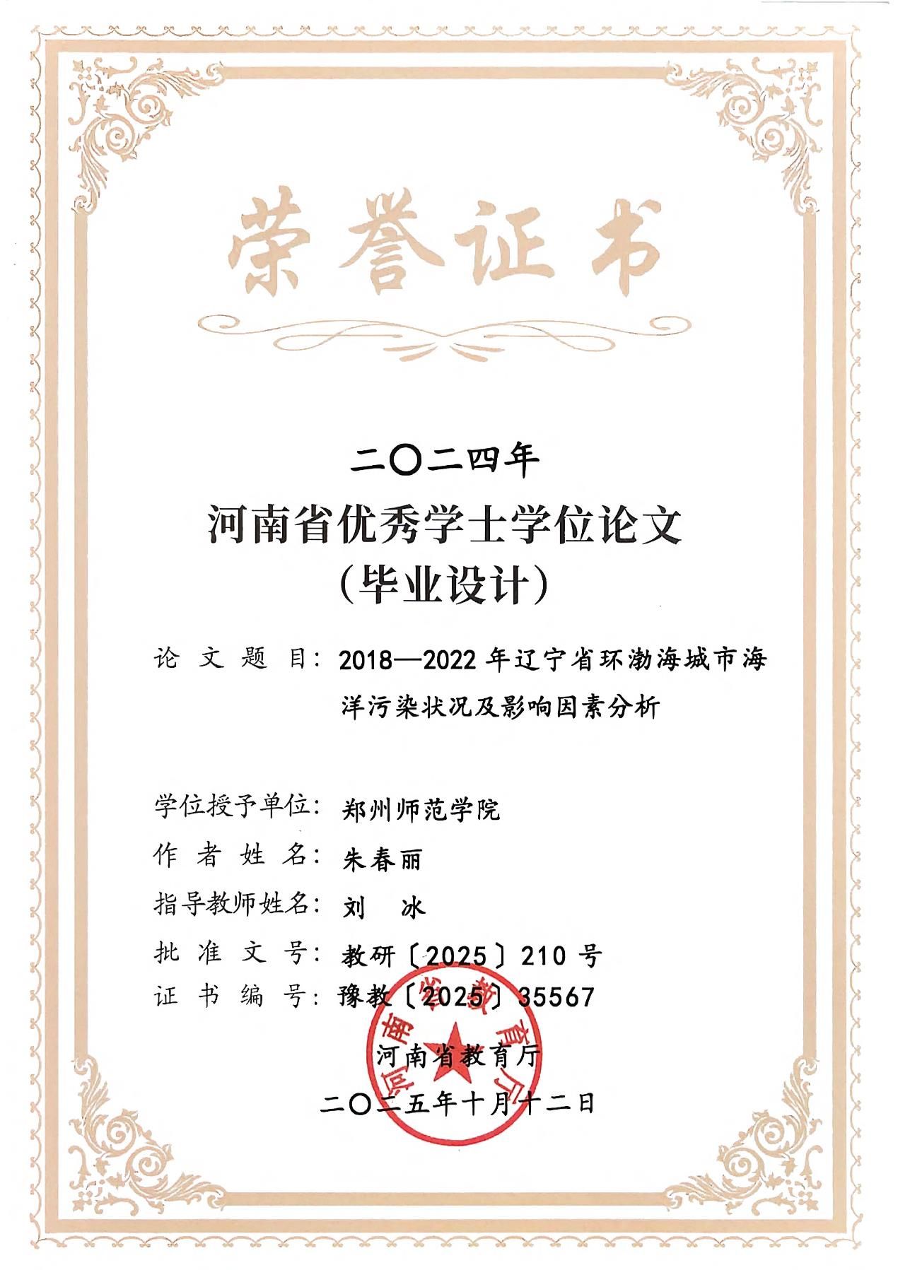 2020级化学专业张琼同学的毕业论文《胺类反应修饰剂和分散剂ZrO₂协同Ru催化苯选择加氢制环己烯研究》,紧密围绕河南省尼龙新材料重点产业链的技术需求,从催化剂设计及工艺优化角度开展系统研究,体现出明确的产业应用价值。应用化学专业朱春丽同学的论文《2018–2022年辽宁省环渤海城市海洋污染状况及影响因素分析》,创新运用机器学习等智能分析方法,对环渤海区域海洋污染开展数据驱动的评估与归因分析,展现了数字技术在环境化工领域的交叉融合优势。